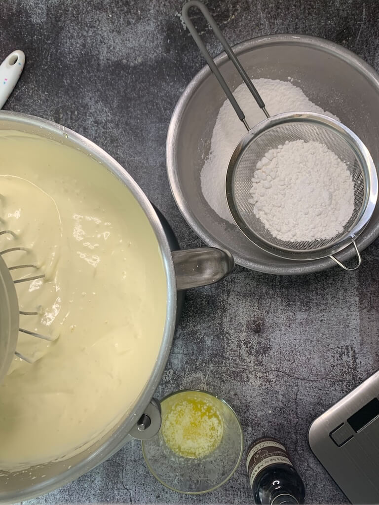 step three: Fold in the sifted flour. Add the flour in 3-4 stages so you don’t deflate the eggs. Fold gently until all the flour is blended in.